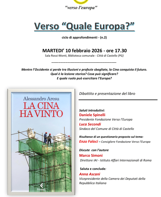 Verso” Quale Europa?” Presentazione del libro :” La Cina ha Vinto” martedi 10 febbraio 2026 ore 17,30 Sala Rossi- Monti Biblioteca Comunale Città di Castello